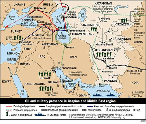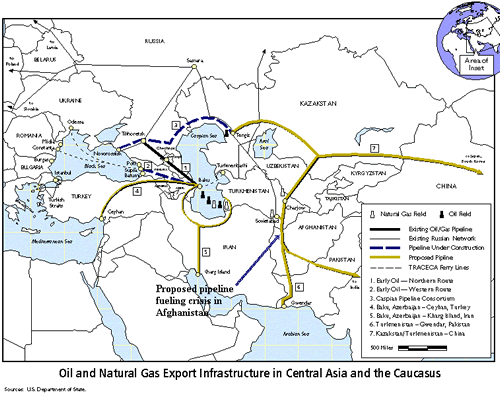 This map shows the plans for the trans-Afghani pipeline which is being vigorously pursued by the world's largest oil companies. Prior to the war in Afghanistan, these companies had already invested hundreds of billions of dollars in cash into the Caspian Sea region; however, because of the reluctance of the Taliban to negotiate a deal for the pipeline, the oil companies had no way of getting the oil to the markets. Now